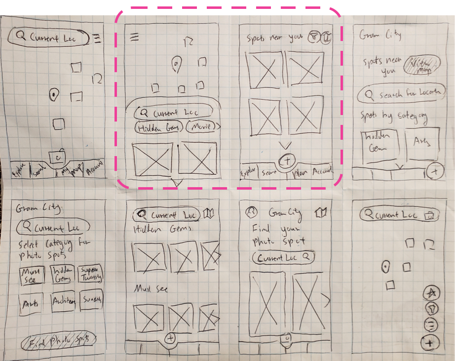 Looking at the steps in the mapping, the main screen is where a user can browse through photo spots nearby. The main screen is the first screen that the user will see after opening the app. By drawing the crazy 8 sketches, I brainstormed ideas on where the main screen will only focus on photos taken by other users, or a map showing nearby photo spots, and a mix of both.