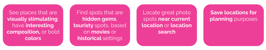 - HMW easily find photo spots based on a destination city or based on the user’s current location?