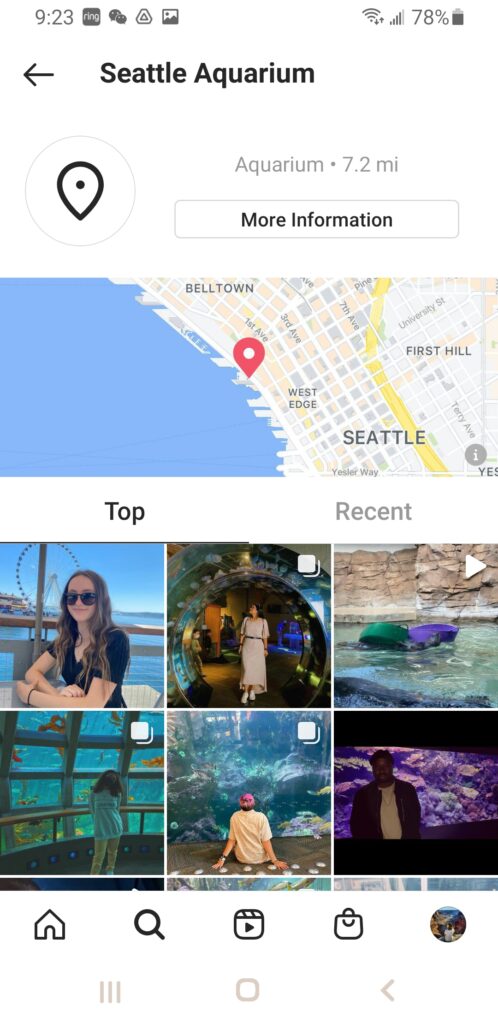 Instagram is a social media platform that focuses on taking and sharing photos in the community. When searching for a location, Instagram separates the photos into groups from top and recent. The organization helps users quickly browse through the images to identify visually pleasing photos. There is also a preview of the location on a map.
