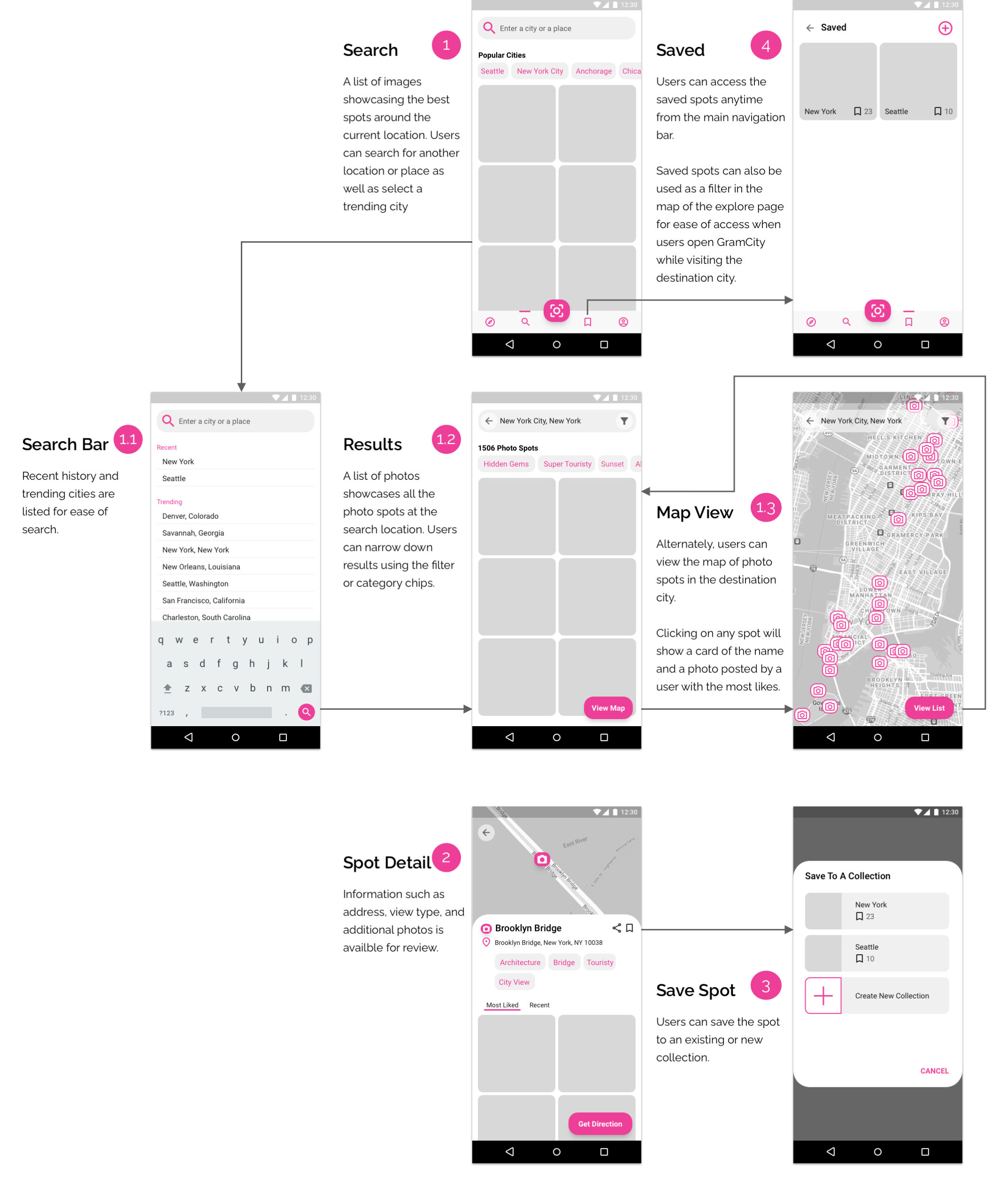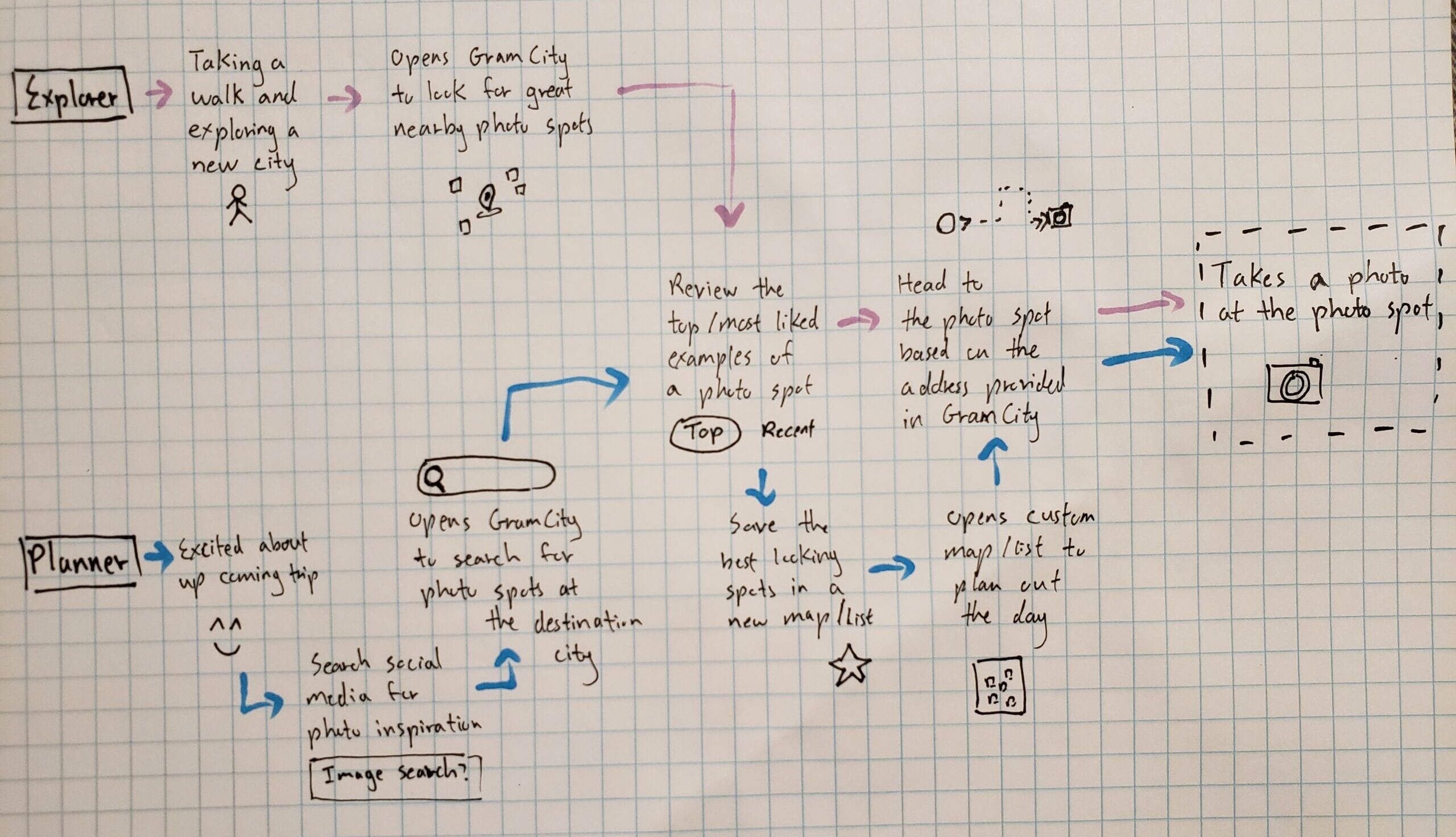 Based on user research highlights, the user base of GramCity is highly visual and wants to find or search photo spots based on location. I performed a lightning demo of existing products that have similar functions, and I looked at applications focused on photos and images such as Instagram and Pinterest. I also reviewed applications that have a great map search feature such as Google Map and Best Parking.