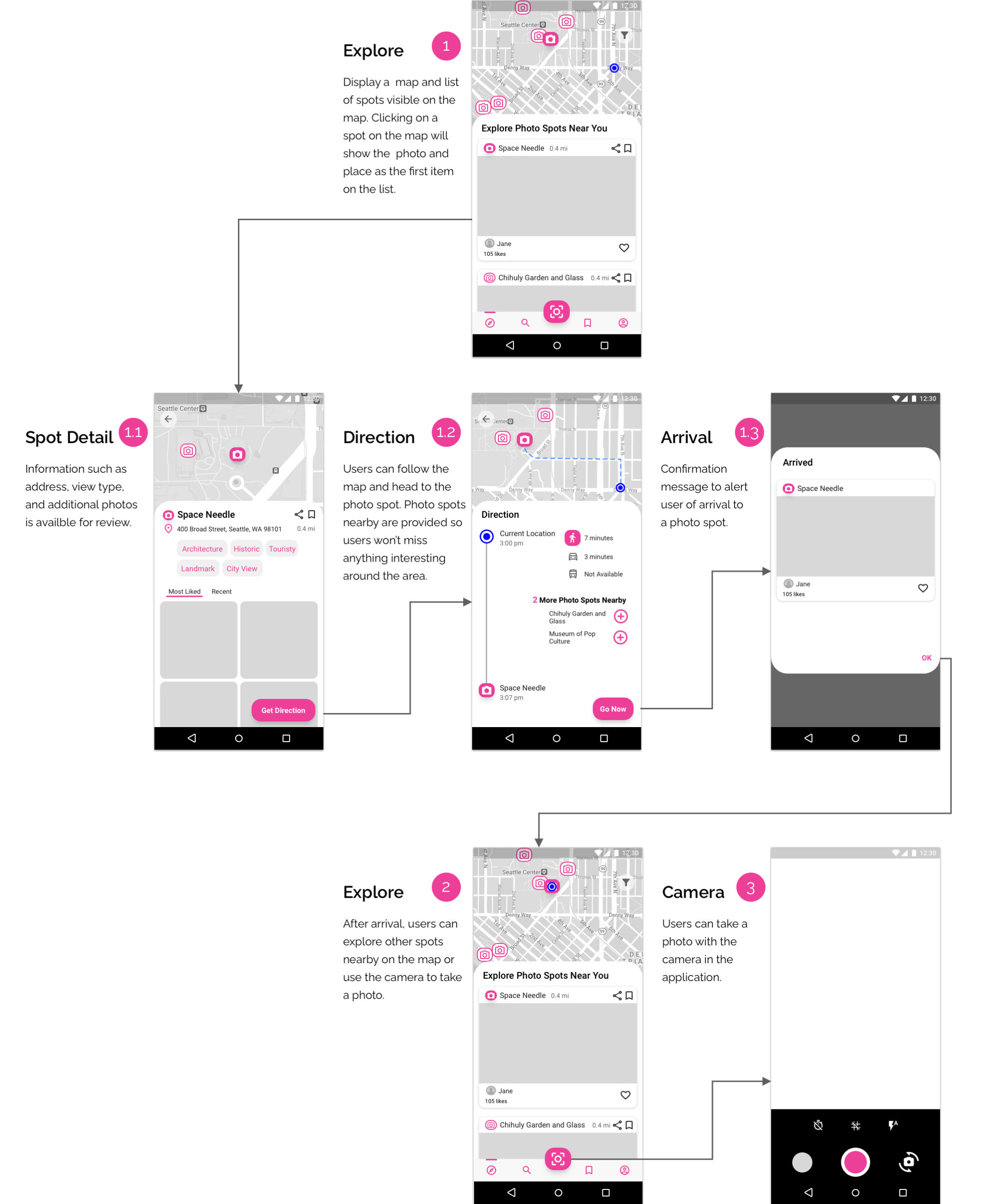 Below is a storyboard of the solution that would take the user from locating the spot, directing them there, and finally to the photo spot to take a photo.