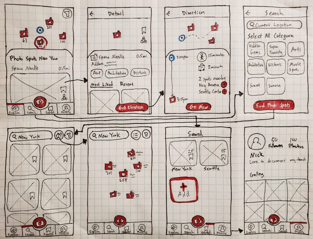 I used Sketch to create a prototype with the focus on helping both the explorer and planner locate their next photo spots. Below is what the prototype looks like before putting in all the photos.