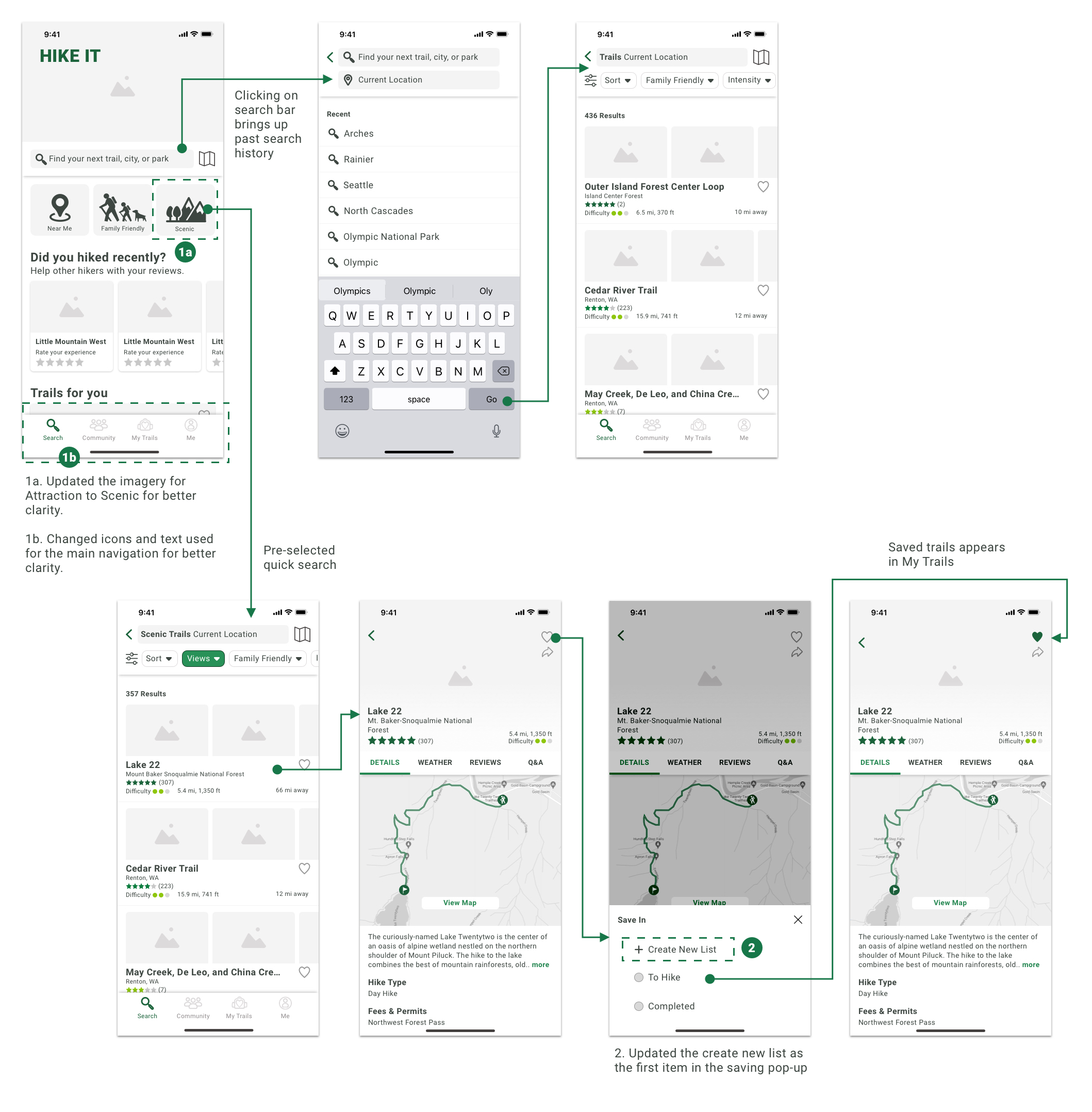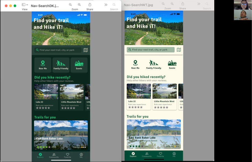 - When looking at the map view, a couple of the participants clicked on the trail title expecting to see the trail details. The simple update is to allow clicking on both the trail name and hiking icon to show trail details.