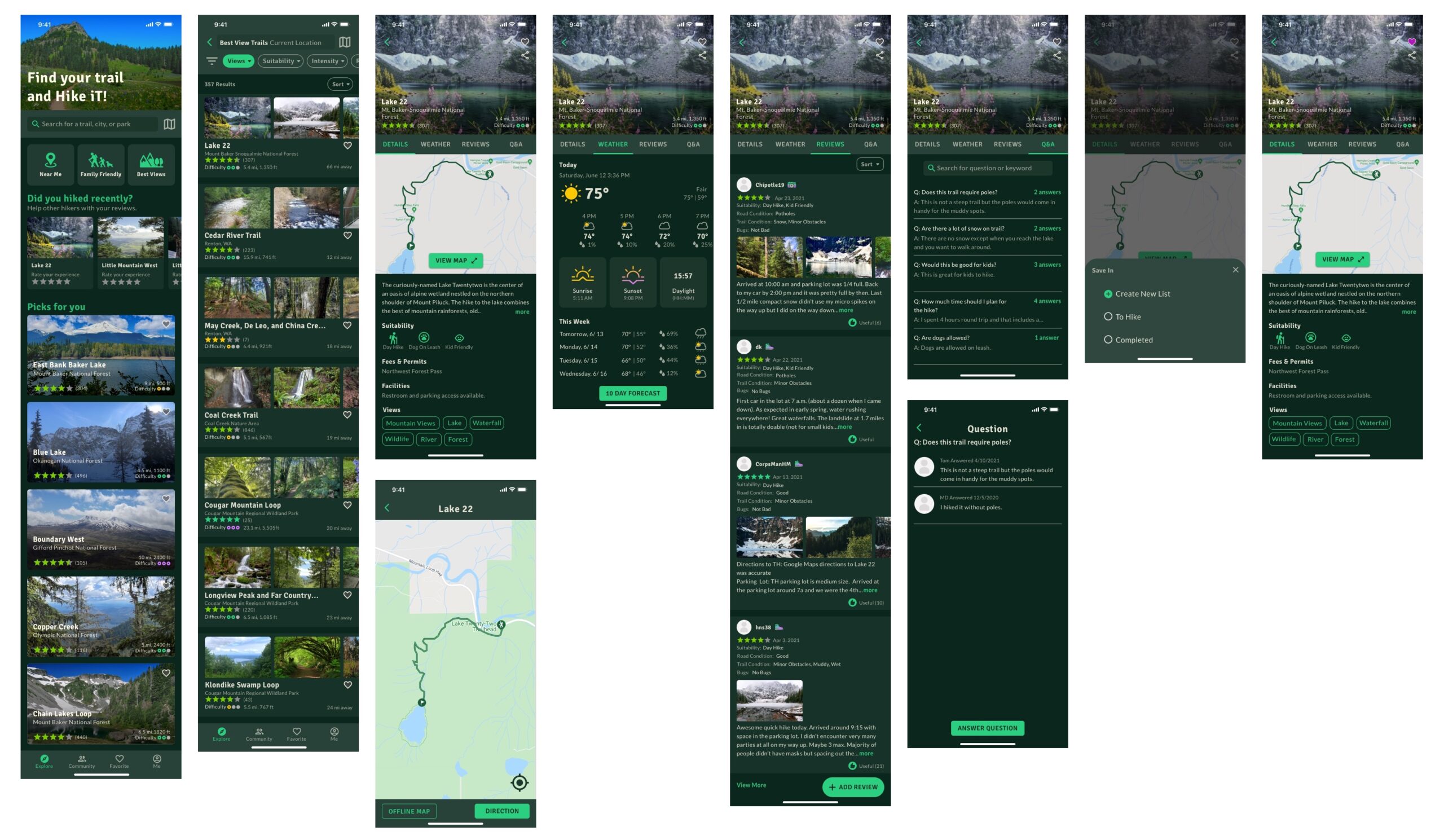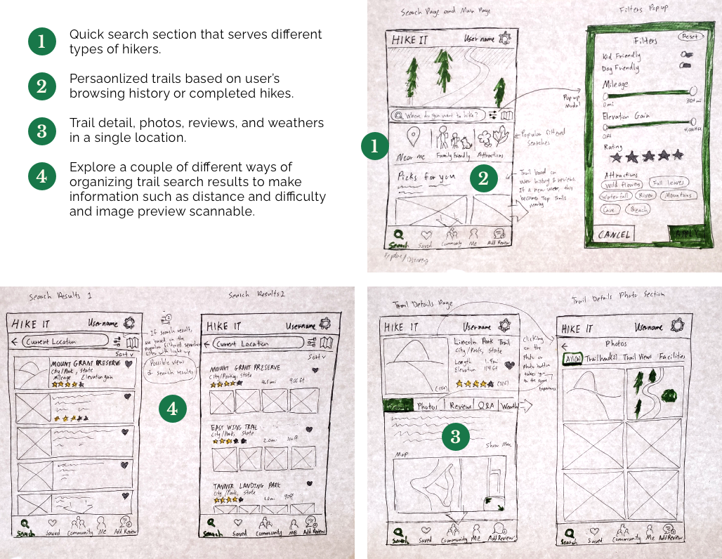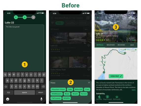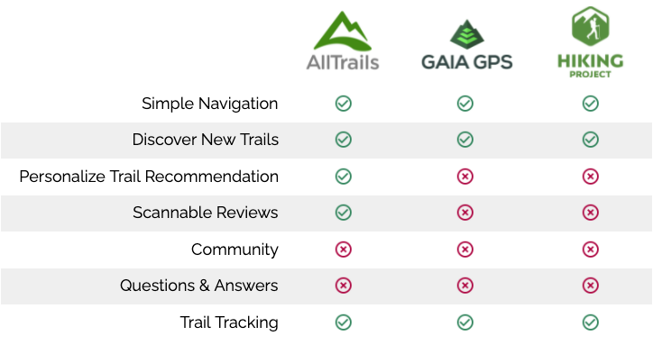 I researched the top 3 popular applications that people currently use when they do trail research. I performed a heuristic analysis of AllTrails, Gaia GPS, and Hiking Project to see where there are areas of opportunity.