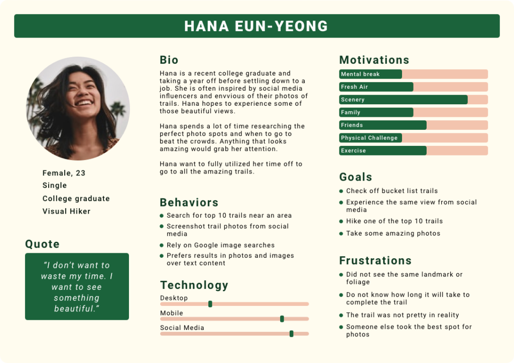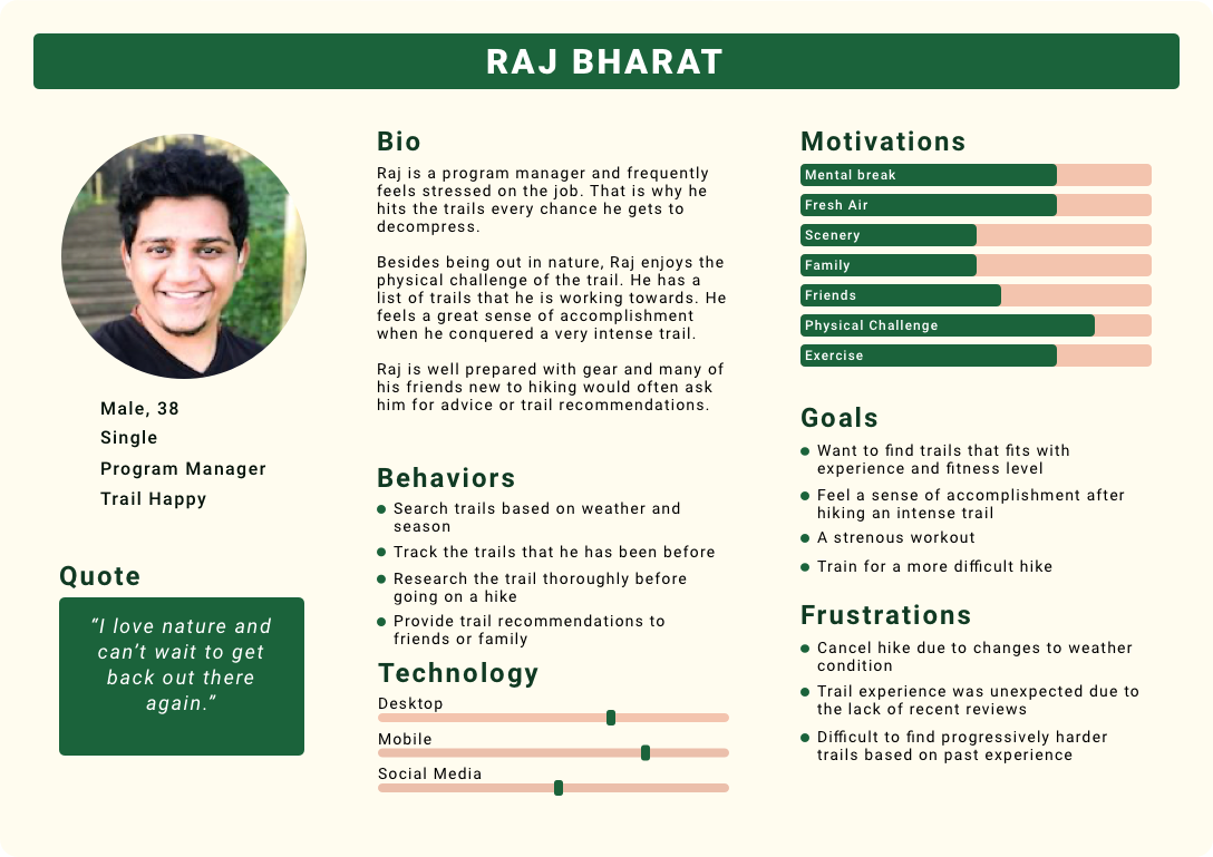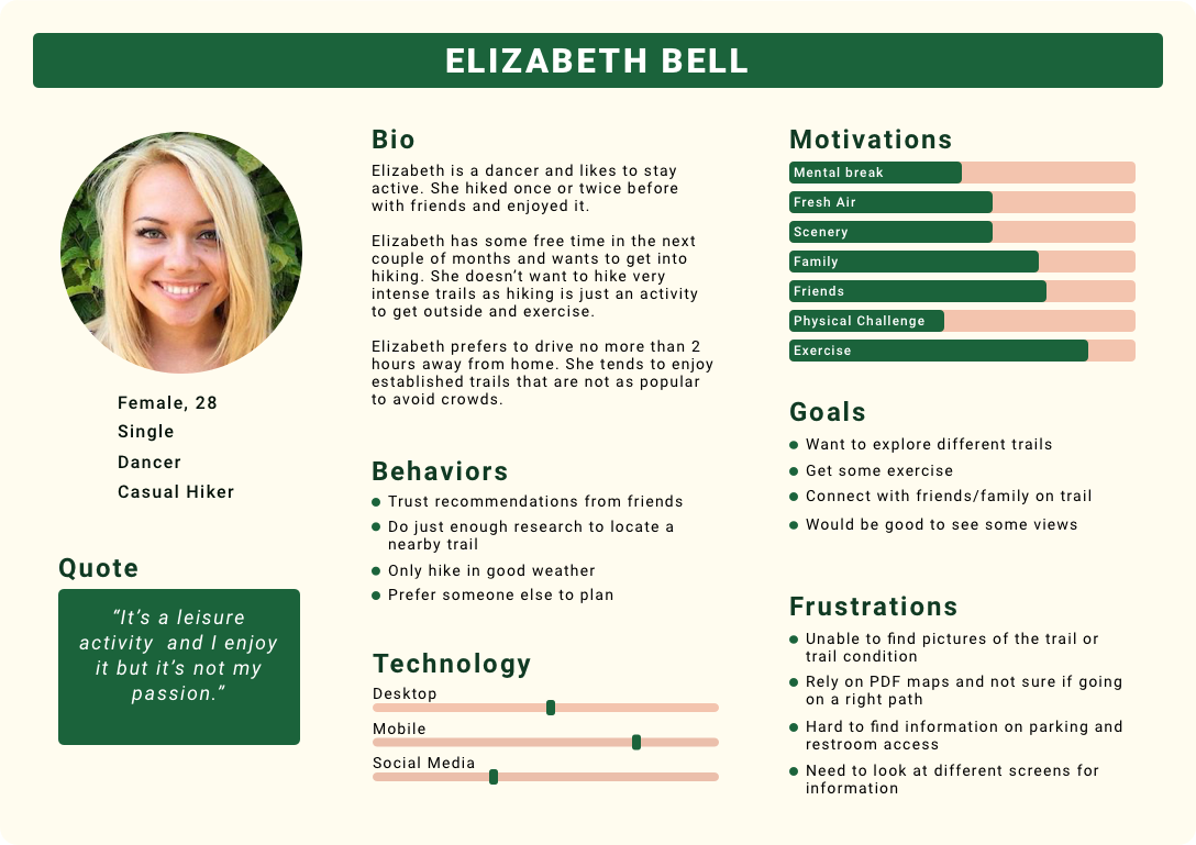 Based on the user interviews, I identified four types of hikers and created an empathy map for each one. Using the empathy maps, I developed a persona to capture the different motivations, goals, and frustrations for trail planning and researching.