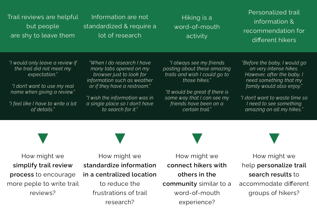 I redefine the problem of planning a hike into four how might we statements based on key insights.