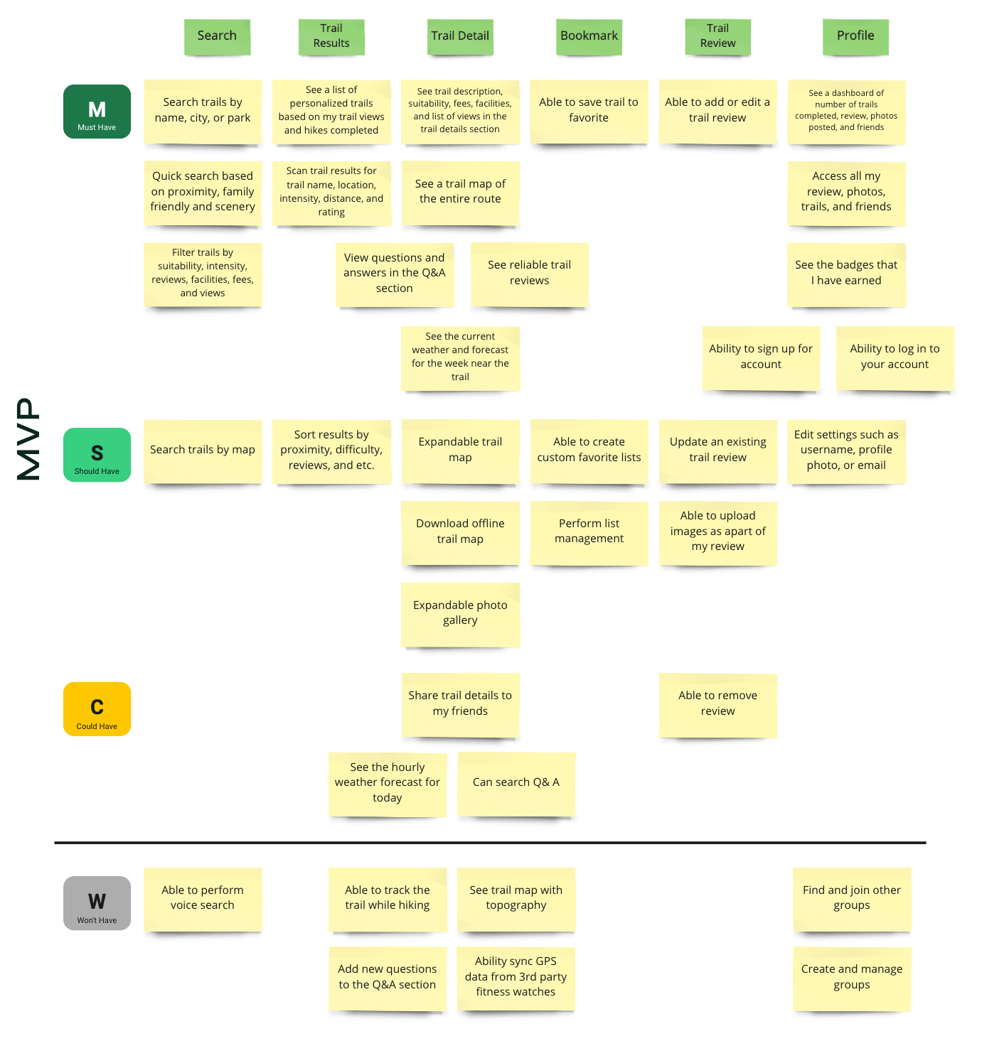 At the minimum, a returning user can search for a trail to save it, add a review, and view reviews from other hikers in the community. These user stories are grouped under the must-have section.